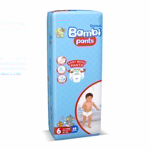 Bambi Baby Diapers Jumbo Size 6 40Pc{"_id":"5e738bc2951f8d471367fd57","name":"Bambi Baby Diapers Jumbo Size 6 40Pc","description":"<p>Sanita Bambi products are made from non-allergic natural fibers and poly-based materials to ensure baby's skin remains perfectly dry and healthy. Sanita Bambi Diapers fit baby's body movements to offer more stretch, flexibility and absorbency.</p>","price":75.41,"substore":["kunooz","whites","store-whites","store-kunooz"],"brand":"BAMBI","sku":"28956","categories":["mom-and-baby","diapering","baby-diapers"],"publish":"1","metafields":{"offer_data":"20%","gtin_1":"6281017352854","Selling_Group_A":4,"Brand_Class_A":5,"In_Promotion_A":2,"New_Launch_A":2,"On_Focus_A":2,"Seasonality_A":2,"kunooz_categories":["baby-diapers","mom-and-baby"],"whites_categories":["baby-diapers","mom-and-baby"],"unitSAP":"EA","kunooz_product_type":[],"health_conditions":[],"frequently_bought":[],"use_it_with":[],"pick_your_free_items":[],"combo_offer":[],"skin_tone":[],"lips":[],"benefits":"","how_to_use":"","what_is":"","therapeutic_uses":"","dosage_and_administration":"","contraindication_and_drug_interaction":"","warning_and_precautions":"","side_effects":"","more_information":"","ingredients":""},"approve":"approved","seller":"5e5ba36356297b5dd7d7df93","uniquesku":["28956"],"attributes":[{"name":"concerns","value":"Baby Diapers","group":"default","_id":"64ad34ab66b1180bf7585eb4"},{"name":"_brand","value":"BAMBI","_id":"691030846db15cf7fbb4f309"}],"inventory_quantity":2,"available":true,"images":[{"image":"5e738bc2951f8d471367fd57/6281017352854.png","caption":"","tags":""},{"image":"62fe10e29014d4261d20acb7/28956-1.jpg","caption":"","tags":""},{"image":"62fe10e29014d4261d20acb9/28956-2.jpg","caption":"","tags":""},{"image":"62fe10e29014d4261d20acbb/28956-3.jpg","caption":"","tags":""}],"media":[],"dimension":{},"inventory_management":"automatic","options":[],"SEO":{"title":"BAMBI Baby Diapers Jumbo,X-Large 40 Diapers"},"files":[],"alias":"baby-diapers-jumbo-x-large-40-diapers","sort_order":0,"created_on":"2020-03-19T15:12:02.510Z","_created_by":"530d7f8bc6b8283a11000003","updated_on":"2025-11-09T06:11:16.281Z","_updated_by":"647ca77ccd69b4dec86358d8","collections":["19-nov-20percent","mother-and-baby-offers","exclude-from-loyalty","whites-best-selling-mother-baby","all-items-live-2024","redbox-exclude-items","non-medicine-2024","weekend-offer","labubu-free-gift"],"tax":"5e7afbf58c3a1a400643f7c3","inventory_management_level":"product","whites-label1-name":"Save SAR 100 & More","whites-label1-color":"#F598AA","kunooz_sort_order":7,"whites_sort_order":67,"compare_price_discount":0,"total_order_count":111,"last_order_id":"OID334695","last_order_date":"2025-06-29T04:22:29.517Z","original_sort_order":0,"gtin":"6281017352854","seller_products":[{"_id":"6575805fdf21f409de17c0f6","publish":"1","inventory_management":"automatic","seller":"65702b6ac477c33b1fa4dc00","approve":"approved","substore":["kunooz-express","kunooz"],"product_name":"Baby Diapers Jumbo,X-Large 40 Diapers","price":75.41,"inventory_quantity":0,"sku":"28956","sort_order":0,"store_id":"4065","inventory_management_level":"product","available":0,"shippingTax":"default","product_id":"5e738bc2951f8d471367fd57","created_on":"2023-12-10T09:09:51.215Z","_created_by":"5e5ba36356297b5dd7d7df93"},{"_id":"657021d24061d4c39ab691df","publish":"1","inventory_management":"automatic","seller":"65701c7f4061d4c39ab60f36","approve":"approved","substore":["kunooz-express","kunooz"],"product_name":"Baby Diapers Jumbo,X-Large 40 Diapers","price":75.41,"inventory_quantity":0,"sku":"28956","sort_order":0,"store_id":"4059","inventory_management_level":"product","available":0,"shippingTax":"default","product_id":"5e738bc2951f8d471367fd57","created_on":"2023-12-06T07:25:07.192Z","_created_by":"5e5ba36356297b5dd7d7df93"}],"sellers":["642005e095b4003ae5f35841","644f59c5dc8fcfbb0c7a4d47","621a32869a1c89c59b909e78","622081906ffd2c0006ed1223","6458e1f79e0cb84b8f917b55","5efb2786bd26106c546b86e5","630239294b1194ad122e2a78","646219af2a880e2b63cc7545","64621a11276b50278407cda4","6256a944cb762ff64f2d01b1","6481a5bc9067665f102ecc48","647d84e729ad2d4da798ecaf","647d855e29ad2d4da79905e4","647d85d1ab992baab3caa297","647d866a4593714d8cf79d6a","647d86b9d72c955c051ed2d4","647d87f18bb27e4d2abf2c61","647d8725345262aace37aaf1","647d876dd72c955c051ee7fb","647d87b4d56add5b9fc95601","6538b78ce971f533f7241c32","65701c7f4061d4c39ab60f36","65702b6ac477c33b1fa4dc00"],"linked_product_sellers":["65702b6ac477c33b1fa4dc00","65701c7f4061d4c39ab60f36","6538b78ce971f533f7241c32","647d87b4d56add5b9fc95601","6256a944cb762ff64f2d01b1","64621a11276b50278407cda4","622081906ffd2c0006ed1223","644f59c5dc8fcfbb0c7a4d47","630239294b1194ad122e2a78","642005e095b4003ae5f35841","621a32869a1c89c59b909e78","6458e1f79e0cb84b8f917b55"],"linked_products":[{"_id":"6575805fdf21f409de17c0f6","publish":"1","seller":"65702b6ac477c33b1fa4dc00","substore":["kunooz-express","kunooz"],"price":75.41,"inventory_quantity":0,"sku":"28956","sort_order":0,"store_id":"4065"},{"_id":"657021d24061d4c39ab691df","publish":"1","seller":"65701c7f4061d4c39ab60f36","substore":["kunooz-express","kunooz"],"price":75.41,"inventory_quantity":0,"sku":"28956","sort_order":0,"store_id":"4059"},{"_id":"6547854f51d3aaa5a647b8f8","price":75.41,"publish":"1","inventory_quantity":0,"sort_order":0,"substore":["whites","whites-express"],"seller":"6538b78ce971f533f7241c32","sku":"28956","store_id":"2024"},{"_id":"651585c8308f82c5eebc5588","publish":"1","seller":"647d87b4d56add5b9fc95601","substore":["whites-express"],"price":75.41,"inventory_quantity":5,"sku":"28956","sort_order":0,"store_id":"2058"},{"_id":"647f0aa11fbcb42d212f6bfc","publish":"1","seller":"6256a944cb762ff64f2d01b1","substore":["whites-express"],"price":75.41,"inventory_quantity":0,"sku":"28956","sort_order":0,"store_id":"2037"},{"_id":"646224435f4700611b316faa","publish":"1","seller":"64621a11276b50278407cda4","substore":["whites-express"],"price":75.41,"inventory_quant