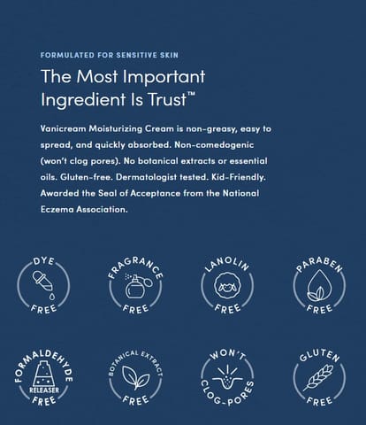 VANICREAM Moisturizing Skin Cream is a fragrance-free, oil-free emollient cream formula with beneficial ingredients that soothe excessively dry, irritated skin. Its fast-absorbing cream locks in essential moisture thanks to ceramides, hyaluronic acid and glycerin. Free of dyes, parabens and other potential irritants, it is ideal for calming very sensitive skin including eczema-prone areas and restoring the skin's protective barrier.